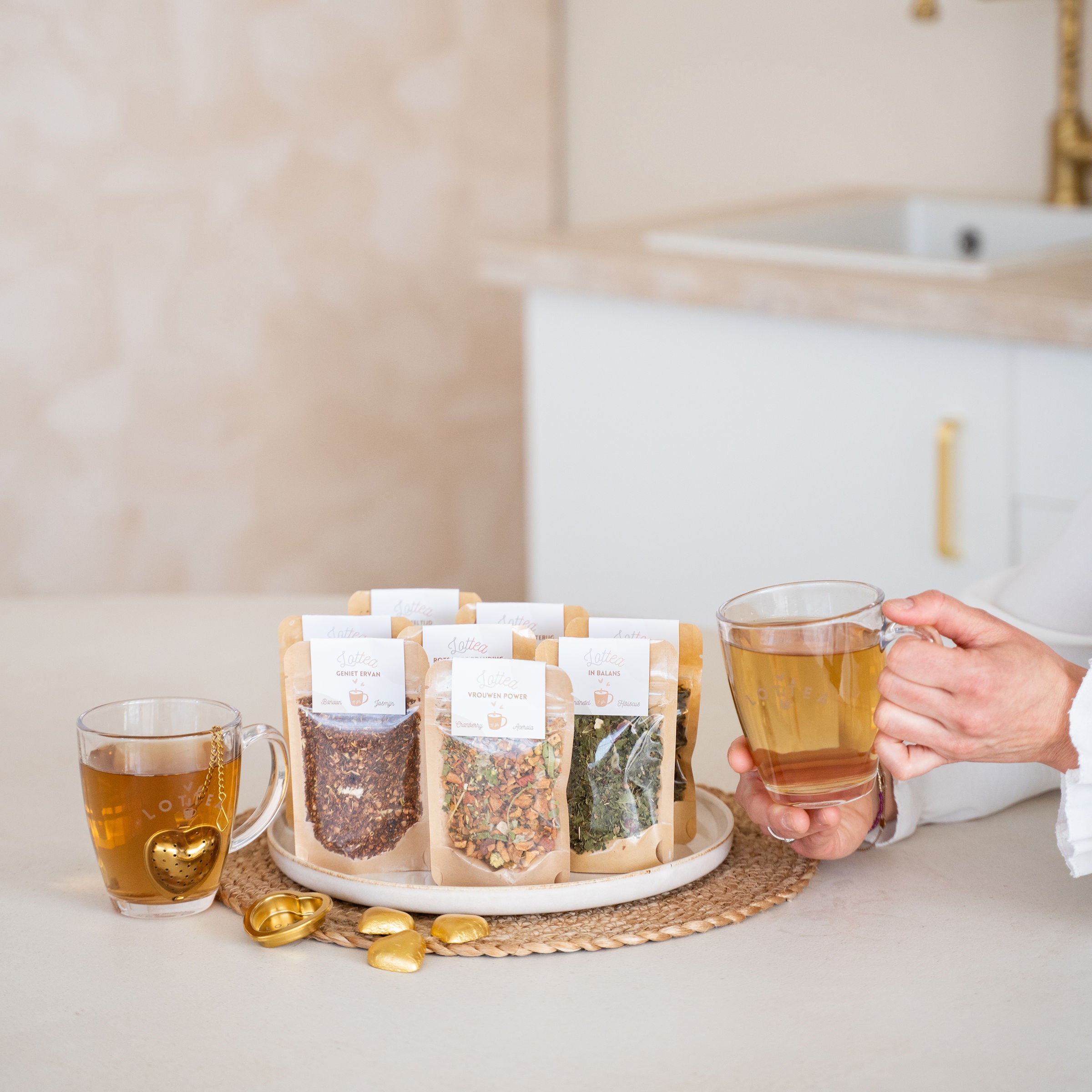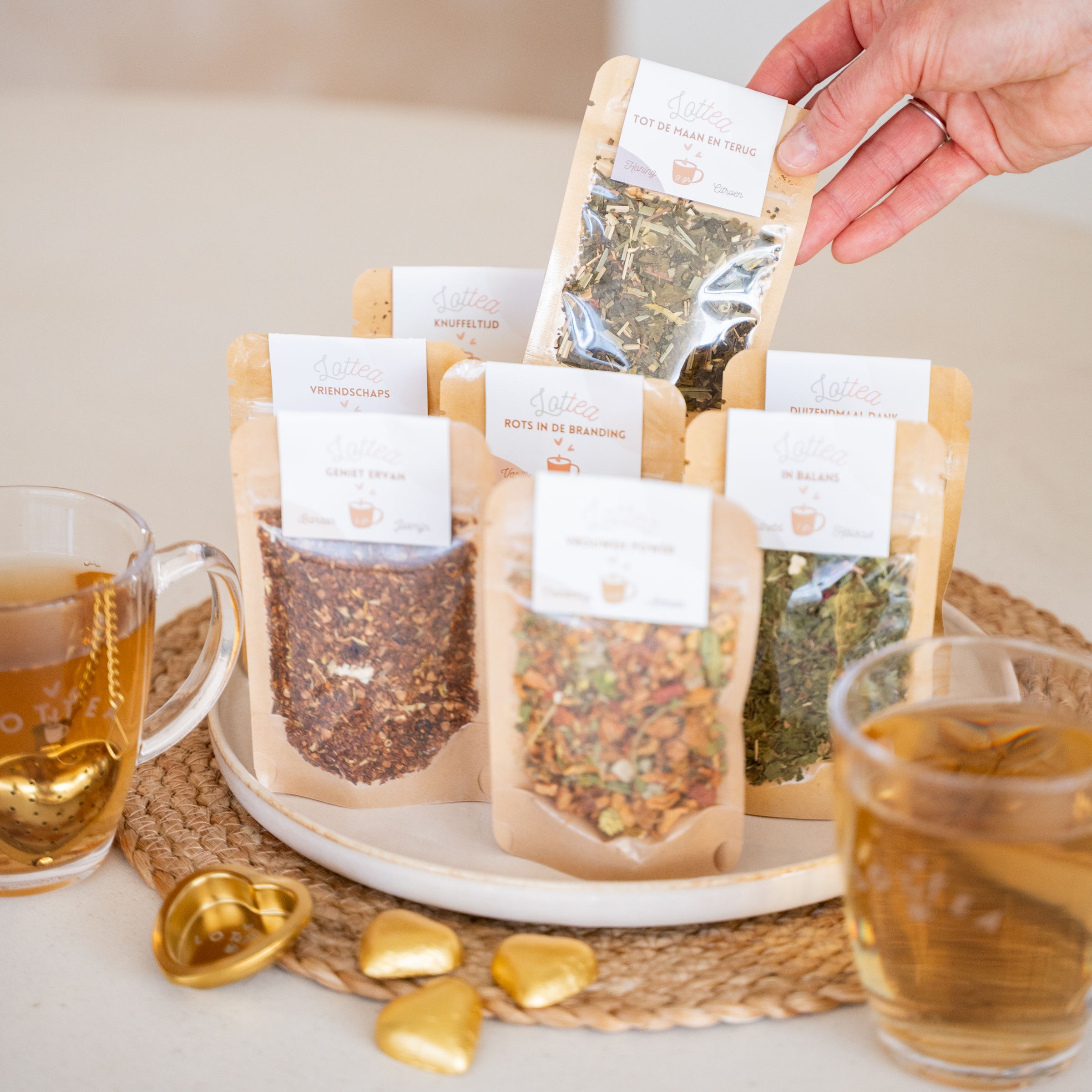 Naast deze heerlijke theeën bevat de Giftbox 2 originele Lottea Theeglazen. Het Lottea Theeglas is een stevig theeglas met groot oor, dat heerlijk comfortabel in de hand ligt. Met een inhoud van 350 ml past er in dit Theeglas heel veel lekkere Lottea thee! Ook bevat de Giftbox ons hartvormig theezeefje; het ideale hulpmiddel voor het zetten van losse thee! Het theezeefje inclusief lekbakje is gemaakt van roestvrijstaal en is voorzien van het originele Lottea logo. Het theezeefje is eenvoudig te openen en te vullen met losse thee. Het is de perfecte oplossing voor het zetten van alle soorten losse thee. Het theefzeefje geeft de thee alle ruimte om zich te ontplooien en de smaken optimaal vrij te geven.