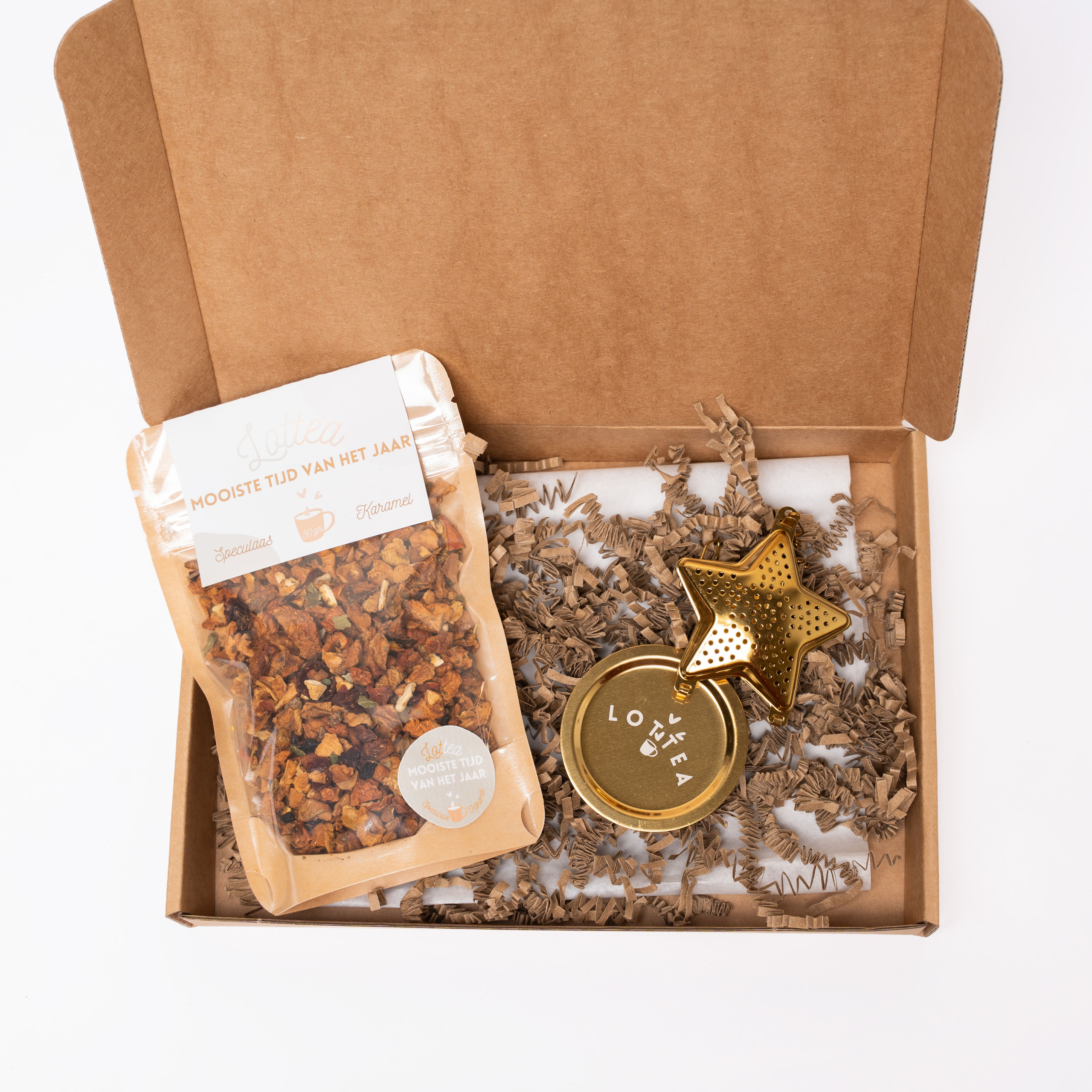 Liefs door de brievenbus! Een aardigheidje, een presentje, een liefdevolle attentie door de brievenbus! Een sfeervol Kerstgeschenkje met een grote zak thee en een handig Theezeefje.