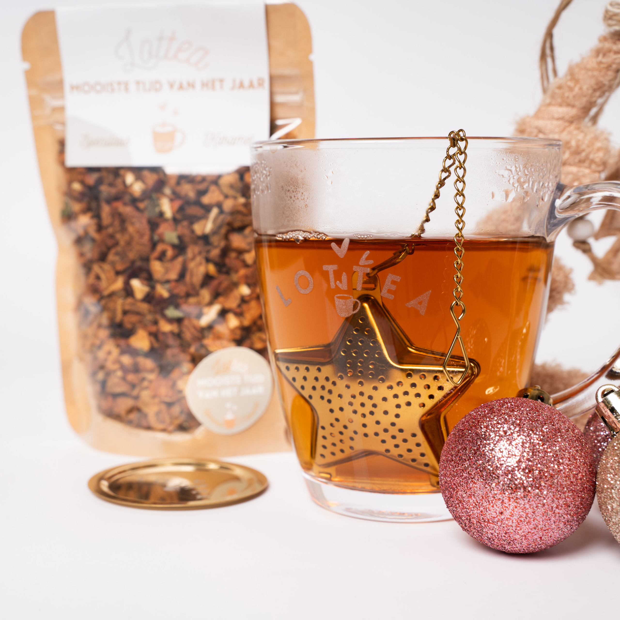 Naast deze grote zak thee bevat de cadeauset ook ons handige Theezeefje in stervorm; het perfecte hulpmiddel voor het zetten van verse thee. Het Theezeefje is eenvoudig te vullen en kan vervolgens in je favoriete theeglas of theemok worden gehangen waardoor de thee alle tijd en ruimte krijgt om zijn heerlijke smaken af te geven. Het theezeefje inclusief lekbakje is gemaakt van roestvrijstaal en is voorzien van het originele Lottea logo. Het theezeefje blijft langer mooi wanneer je hem met de hand afwast in plaats van in de vaatwasser. Maak van een kopje thee drinken een sfeervolle en smaakvolle beleving! Een momentje van rust dat je niet alleen jezelf maar ook een ander van harte gunt.