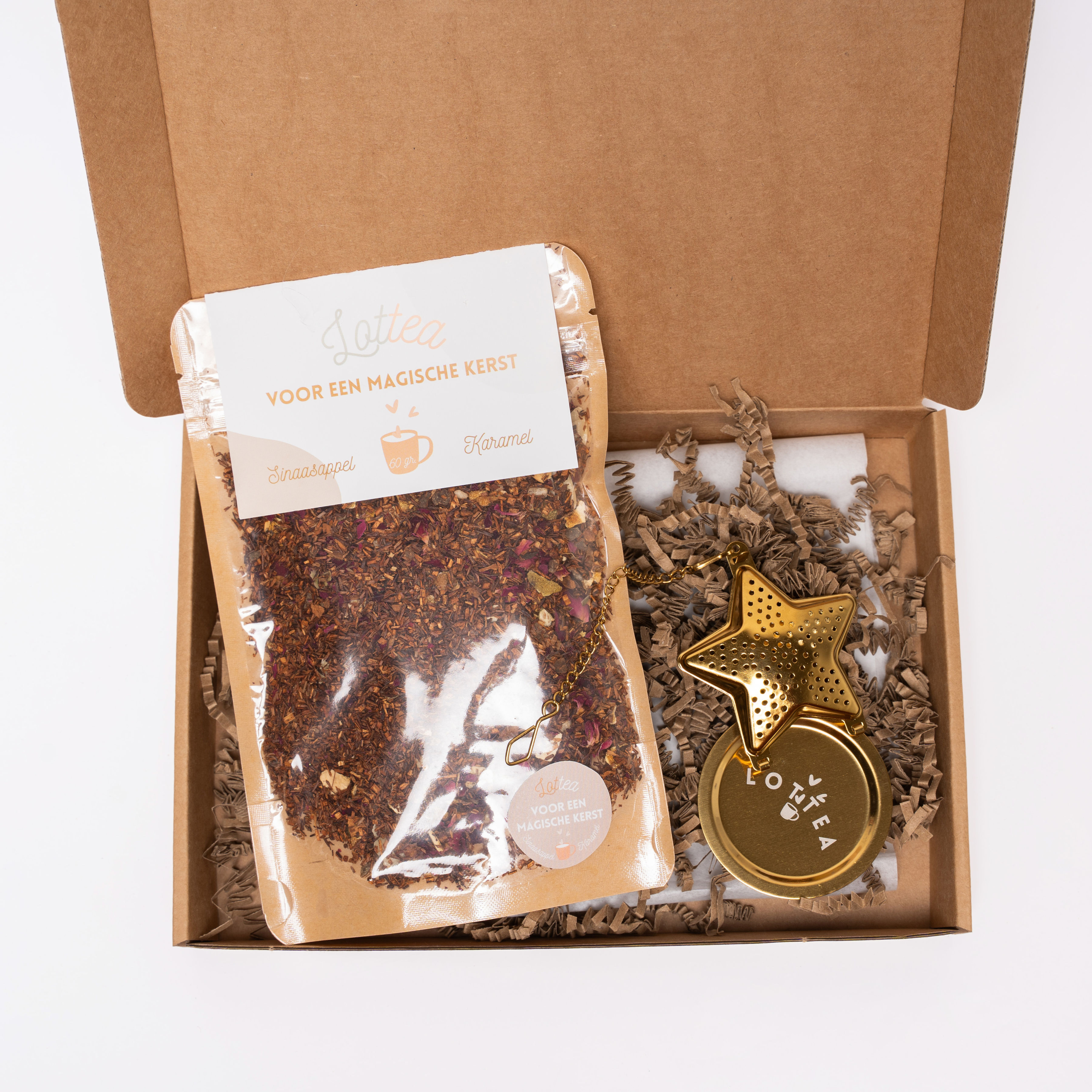 Liefs door de brievenbus! Een aardigheidje, een presentje, een liefdevolle attentie door de brievenbus! Een sfeervol Kerstgeschenkje met een grote zak thee en een handig Theezeefje.