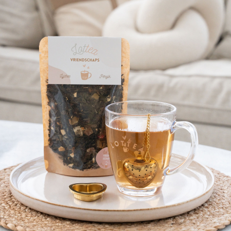 Naast deze grote zak thee bevat de cadeauset ook ons handige Theezeefje in hartjesvorm; het perfecte hulpmiddel voor het zetten van verse thee. Het Theezeefje is eenvoudig te vullen en kan vervolgens in je favoriete theeglas of theemok worden gehangen waardoor de thee alle tijd en ruimte krijgt om zijn heerlijke smaken af te geven. Het theezeefje inclusief lekbakje is gemaakt van roestvrijstaal en is voorzien van het originele Lottea logo. Verkrijgbaar in 2 varianten: zilver- en goudkleurig. Het theezeefje blijft langer mooi wanneer je hem met de hand afwast in plaats van in de vaatwasser. Maak van een kopje thee drinken een sfeervolle en smaakvolle beleving! Een momentje van rust dat je niet alleen jezelf maar ook een ander van harte gunt.