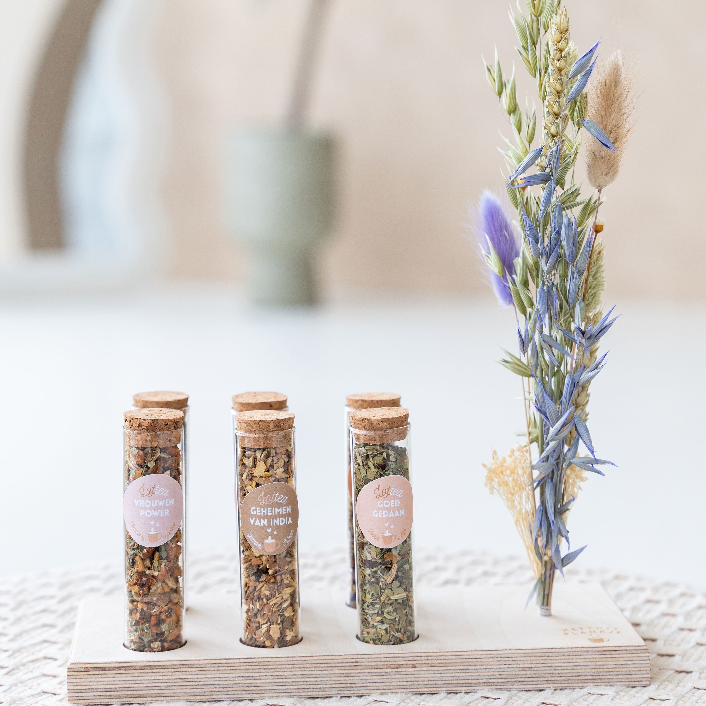 - 6 soorten losse thee (voor ongeveer 4-5 kopjes thee per buisje)