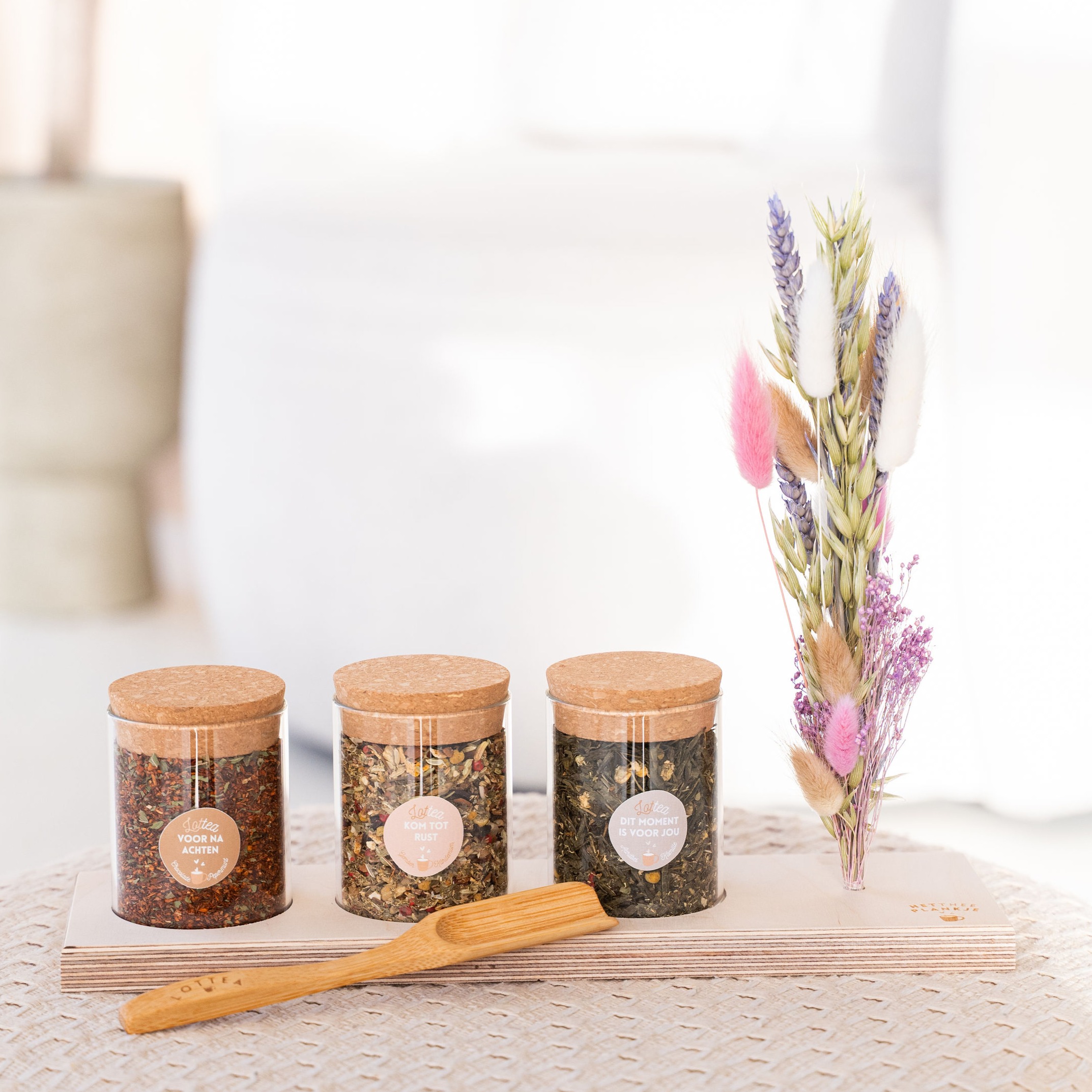 - 3 soorten losse thee in mooie glazen bewaarpotten (iedere pot bevat zo’n 50 gram thee, goed voor ongeveer 25 kopjes thee per pot)